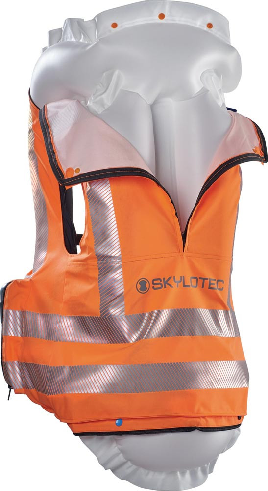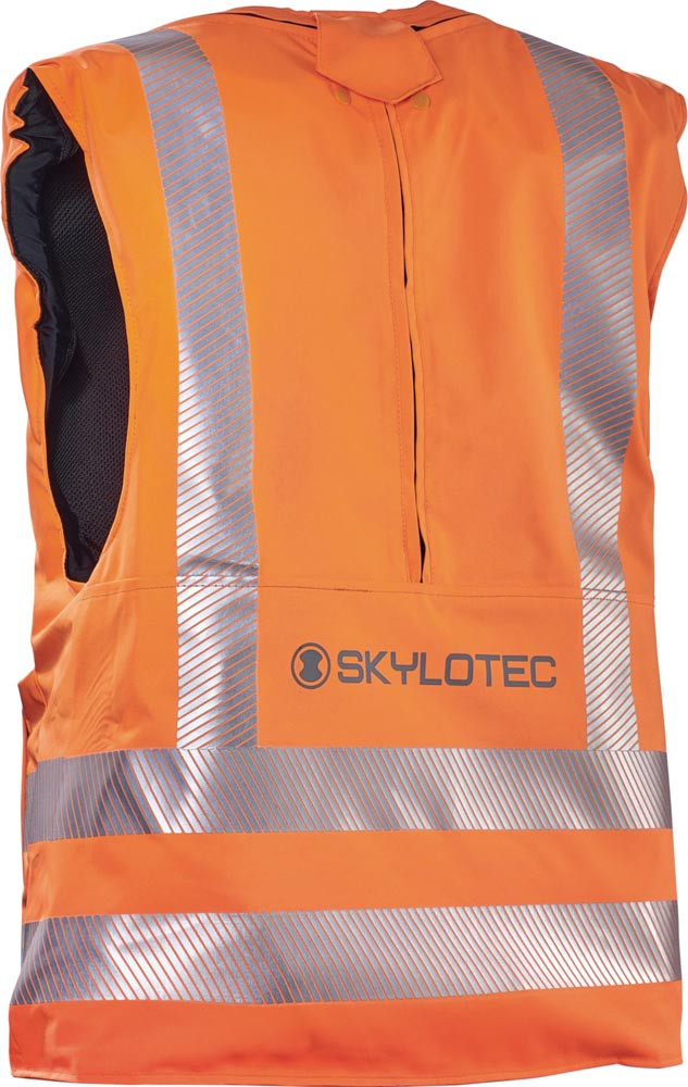 dient zur Reduzierung von Verletzungen bei Stürzen aus geringer Höhe · sie besteht aus einer Weste mit Reflektoren und einem integrierten Airbag aus reißfestem Material, der sich im Falle eines Sturzes aufbläst · SKYVEST wird über eine Druckflasche befüllt, die mit einer pyrotechnischen Auslösung versehen ist · die Befüll-Einheit ist mit einer elektronischen Sensoreinheit verbunden, welche eine Sturzsituation anhand von Parametern wie Bewegung, Beschleunigung und Lage der Person erkennt · auf diese Weise wird nicht nur der Brustkorb und Rücken mitsamt Wirbelsäule geschützt, sondern zusätzlich auch der Hinterkopf- und Steißbereich · die Weste wird mit drei Klick-Verschlüssen angelegt und ist nach Auslösen des Airbags wieder verwendbar · über eine Dauer von 24 Stunden flexibel, unabhängig und universell einsetzbar