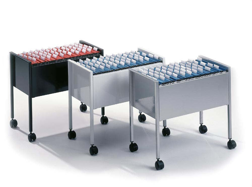 ∙ Diese Aktenwagen bieten viel Platz für den mobilen Arbeitsplatz ∙ Wahlweise einbahnig, für 80 Hängemappen DIN A4 oder doppelbahnig, für 2 x 50 Hängemappen DIN A4 ∙ Hochwertige Epoxidharz-Beschichtung ∙ 4 Lenkrollen, davon 2 mit Bremse