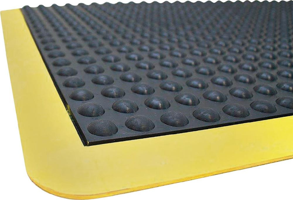 Naturgummi-Matte mit genoppter Oberfläche für trockene Innenbereiche · Temperaturbeständigkeit von -30 °C bis +50 °C · Mattenstärke 14 mm · optimal für Arbeitsplätze mit langen statischen Stehphasen · Rutschfestigkeit 30 BPN gemäß ASTM E304 · Farbe schwarz/gelb