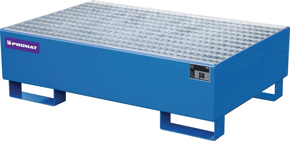 zur Lagerung von 200-l-Fässern oder Kleingebinde · nach Übereinstimmungserklärung (ÜHP) gemäß StawaR, zugelassen für entzündbare Flüssigkeiten der GHS-Kategorien 1-3, gewässergefährdende Flüssigkeiten der GHS-Kategorien 1-4 · robuste 3-mm-Stahlblech-Konstruktion · mit verzinktem Gitterrost · mit Füßen (der Gabelhubwagen muss die Wanne zwischen den Füßen heben) · Tragfähigkeit 1000 kg/m² · Aufwendig verarbeitete Z-Kantung für optimalen Halt des Gitterrostes