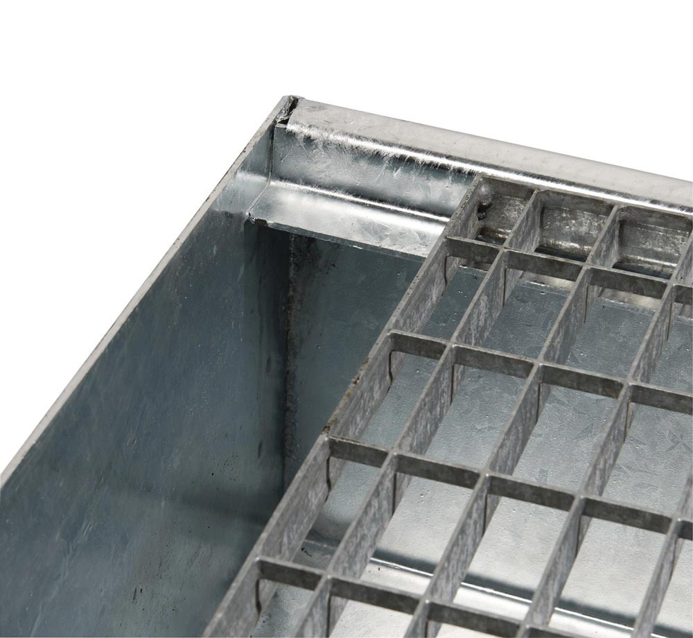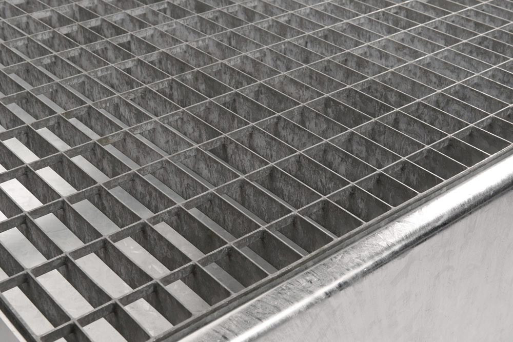 zur Lagerung von 200-l-Fässern oder Kleingebinde · nach Übereinstimmungserklärung (ÜHP) gemäß StawaR, zugelassen für entzündbare Flüssigkeiten der GHS-Kategorien 1-3, gewässergefährdende Flüssigkeiten der GHS-Kategorien 1-4 · robuste 3-mm-Stahlblech-Konstruktion · mit verzinktem Gitterrost · mit Füßen (der Gabelhubwagen muss die Wanne zwischen den Füßen heben) · Tragfähigkeit 1000 kg/m² · Aufwendig verarbeitete Z-Kantung für optimalen Halt des Gitterrostes
