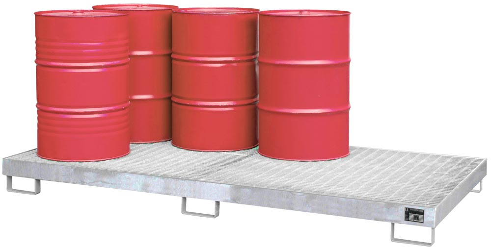 ∙ Aus 3 mm Stahlblech ∙ Mit verzinktem Gitterrost ∙ Stützfüße mit 100 mm Unterfahrhöhe ∙ Wahlweise feuerverzinkt oder mit hochwertiger Lackierung ∙ Zur Lagerung von 200-l-Fässern, auch mit 60-l-Fässern und Kleingebinden kombinierbar