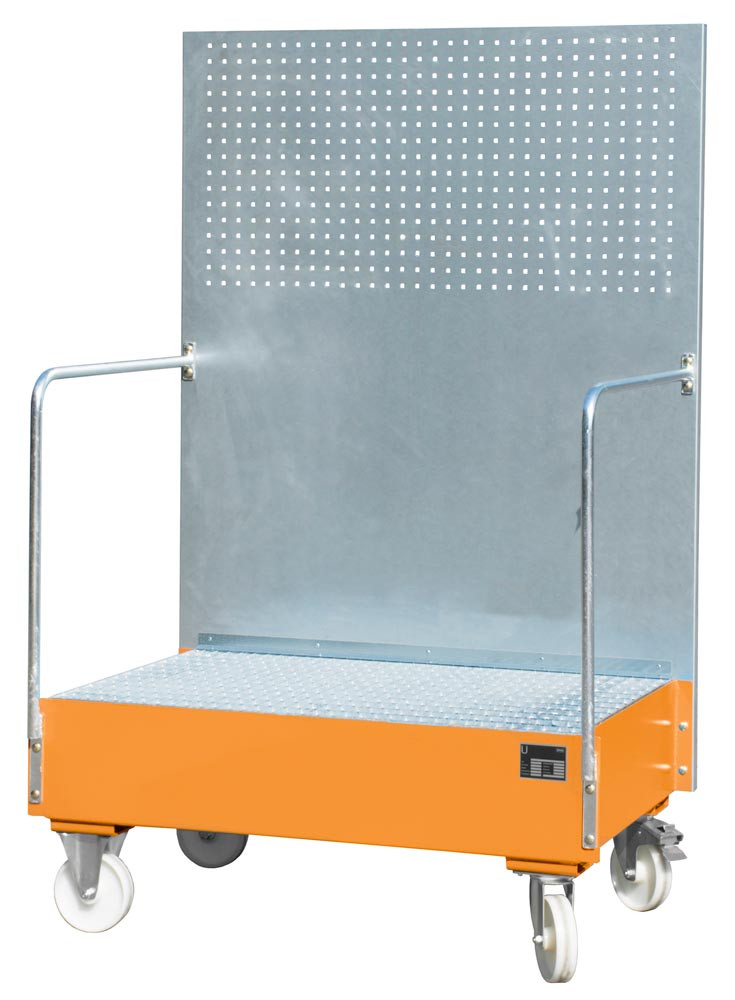 Auffangwanne mit Lochplatte, 3 mm Stahlblech, RAL 2000, fahrbar, für 2 St. 200-l-Fass, stehend Lagern, BxTxH 870x1290x2015 mm, Auffangvol. 215 l