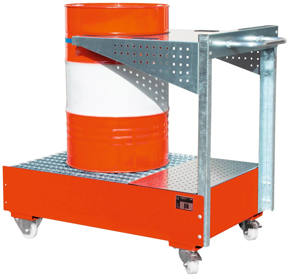 Auffangwanne mit Lochplatte, 3 mm Stahlblech, RAL 3000, fahrbar, für 1 St. 200-l-Fass, stehend Lagern, BxTxH 1450x800x1195 mm, Auffangvol. 215 l