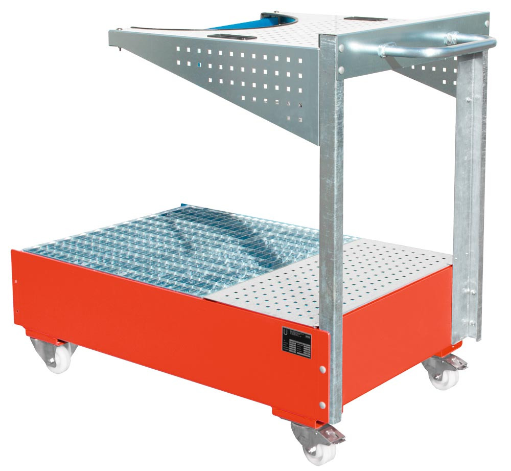 ∙ Mobiles, sicheres und einfaches Abfüllen von Ölen etc. an verschiedenen Verbrauchsstellen ∙ Auffangwanne aus 3 mm Stahlblech inkl. verzinktem, herausnehmbarem Gitterrost ∙ Traglast 1000 kg/m2 ∙ Stabile, verzinkte Stahlblechplatte mit Quadratlochung 10 x 10 mm, im fortlaufenden 38-mm-Raster für freie Positionierung von Werkzeughaltern ∙ Feuerverzinkte Schiebegriffe