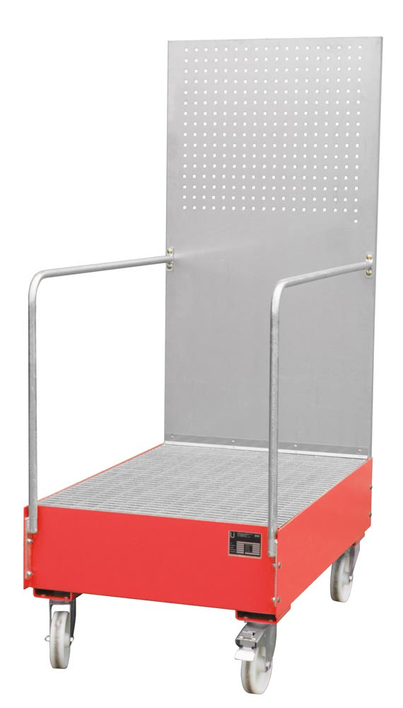 Auffangwanne mit Lochplatte, 3 mm Stahlblech, RAL 3000, fahrbar, für 2 St. 200-l-Fass, stehend Lagern, BxTxH 1280x800x2015 mm, Auffangvol. 215 l