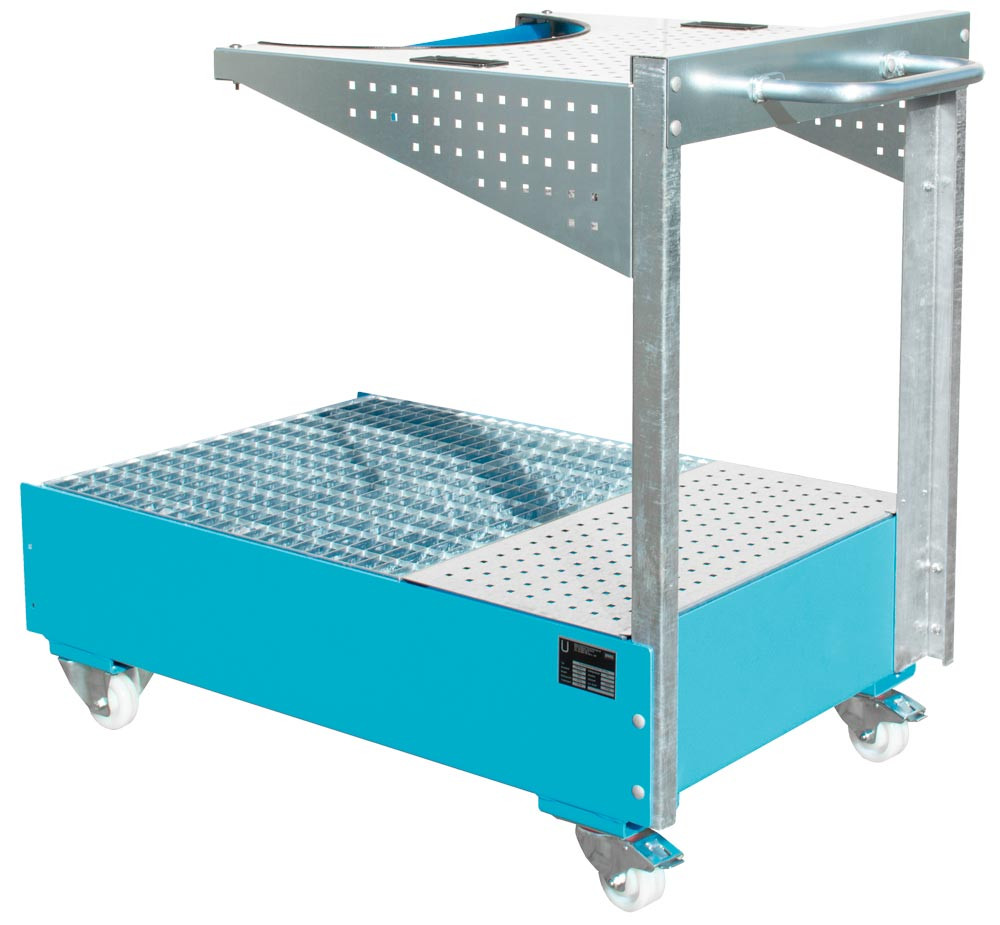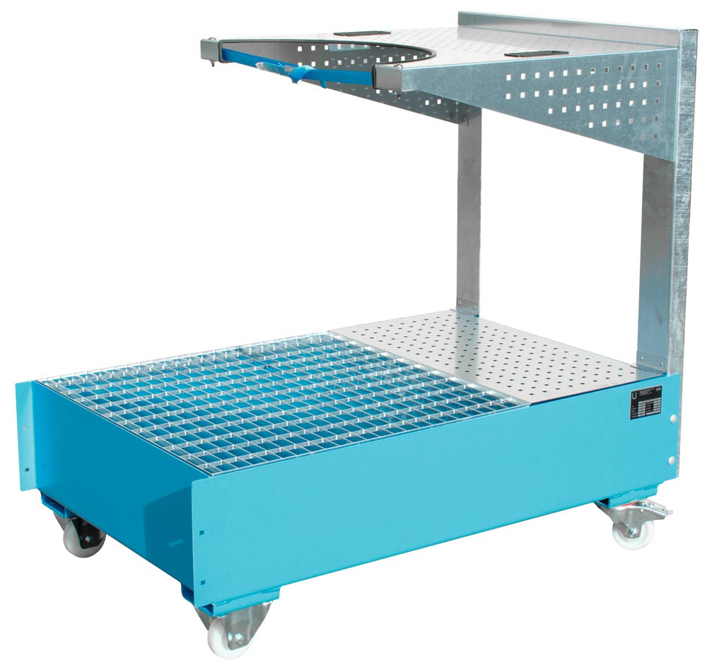 ∙ Mobiles, sicheres und einfaches Abfüllen von Ölen etc. an verschiedenen Verbrauchsstellen ∙ Auffangwanne aus 3 mm Stahlblech inkl. verzinktem, herausnehmbarem Gitterrost ∙ Traglast 1000 kg/m2 ∙ Stabile, verzinkte Stahlblechplatte mit Quadratlochung 10 x 10 mm, im fortlaufenden 38-mm-Raster für freie Positionierung von Werkzeughaltern ∙ Feuerverzinkte Schiebegriffe