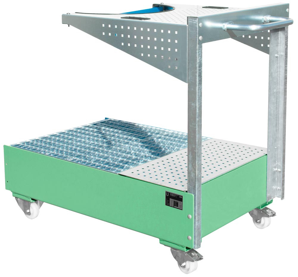 ∙ Mobiles, sicheres und einfaches Abfüllen von Ölen etc. an verschiedenen Verbrauchsstellen ∙ Auffangwanne aus 3 mm Stahlblech inkl. verzinktem, herausnehmbarem Gitterrost ∙ Traglast 1000 kg/m2 ∙ Stabile, verzinkte Stahlblechplatte mit Quadratlochung 10 x 10 mm, im fortlaufenden 38-mm-Raster für freie Positionierung von Werkzeughaltern ∙ Feuerverzinkte Schiebegriffe