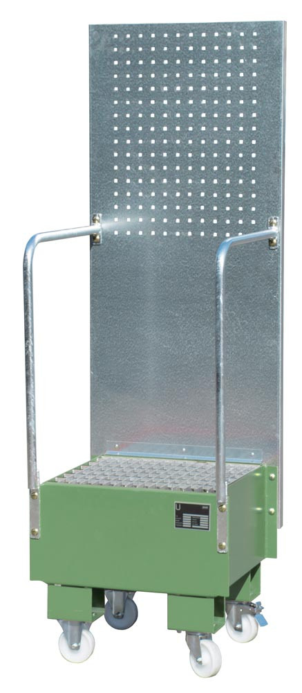 Auffangwanne mit Lochplatte, 3 mm Stahlblech, RAL 6011, fahrbar, für 1 St. 60-l-Fass, stehend Lagern, BxTxH 570x590x1775 mm, Auffangvol. 60 l