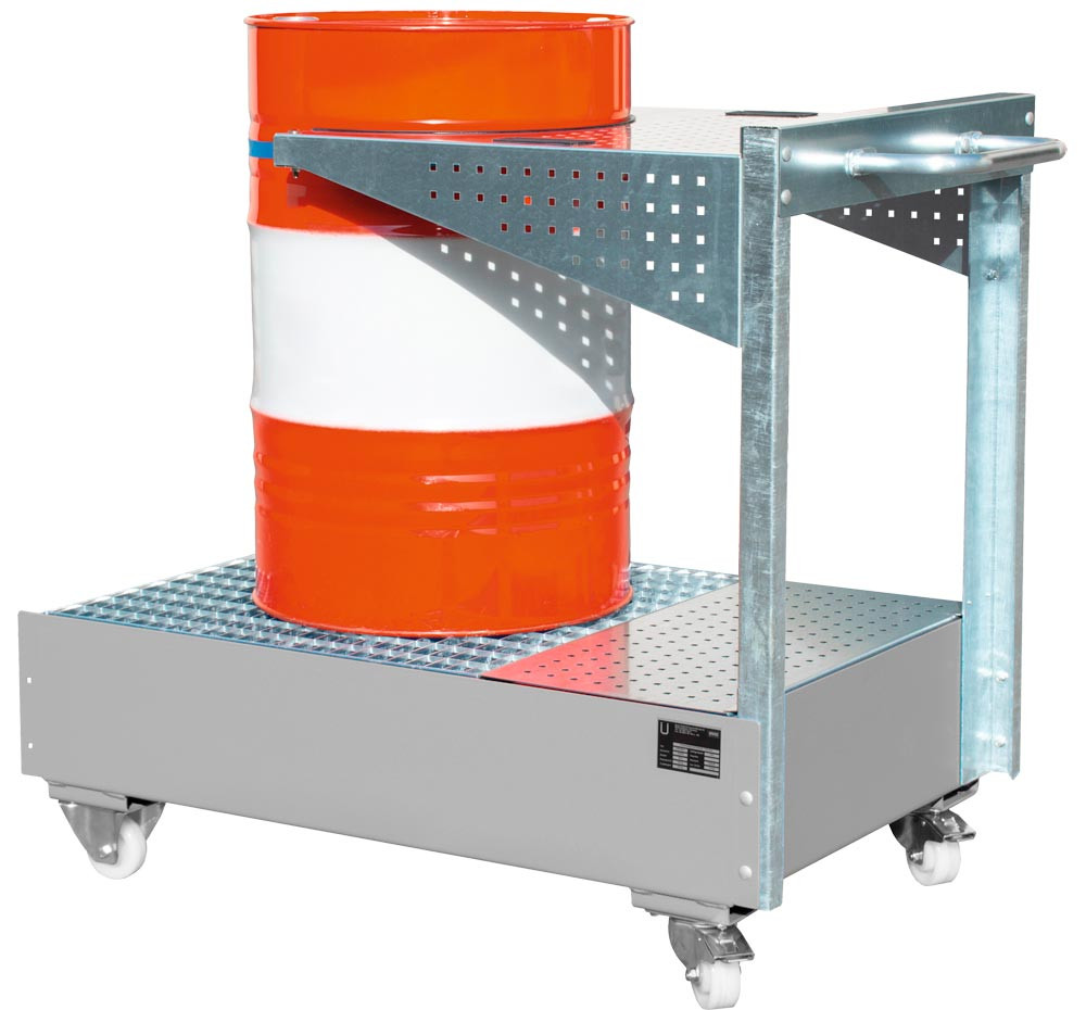 Auffangwanne mit Lochplatte, 3 mm Stahlblech, RAL 7005, fahrbar, für 1 St. 200-l-Fass, stehend Lagern, BxTxH 1450x800x1195 mm, Auffangvol. 215 l
