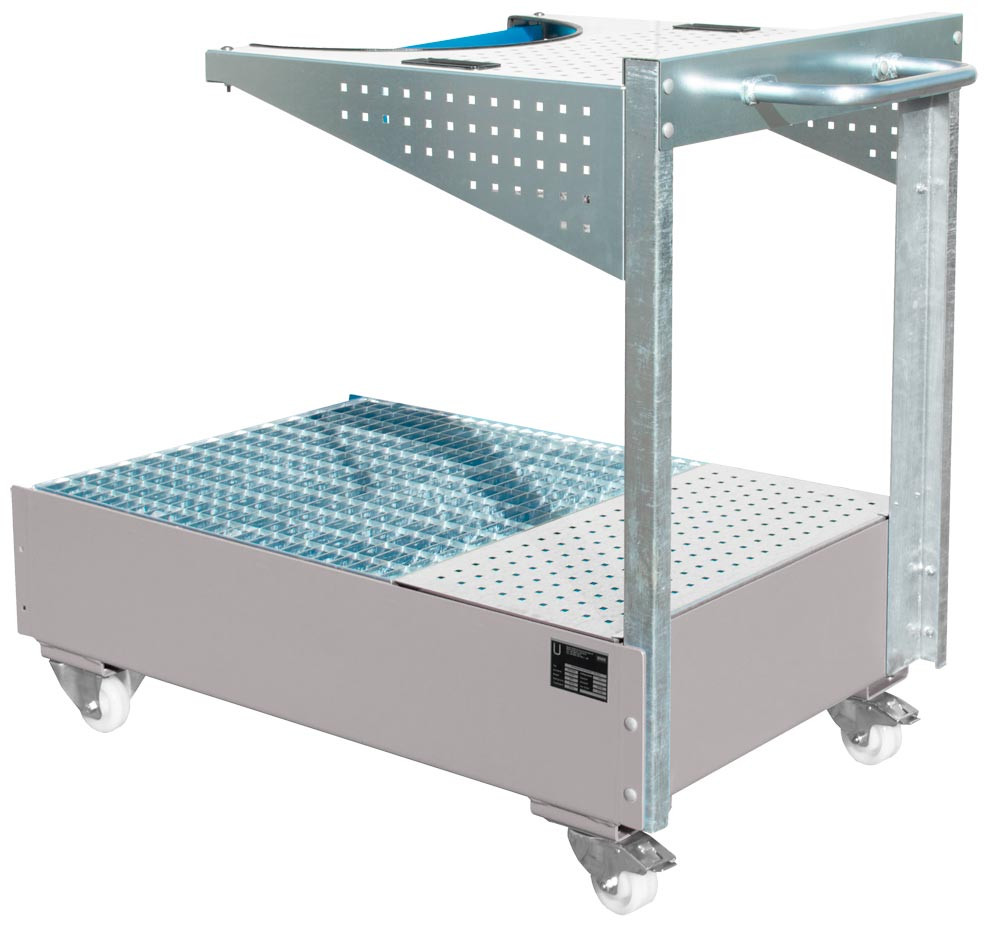 ∙ Mobiles, sicheres und einfaches Abfüllen von Ölen etc. an verschiedenen Verbrauchsstellen ∙ Auffangwanne aus 3 mm Stahlblech inkl. verzinktem, herausnehmbarem Gitterrost ∙ Traglast 1000 kg/m2 ∙ Stabile, verzinkte Stahlblechplatte mit Quadratlochung 10 x 10 mm, im fortlaufenden 38-mm-Raster für freie Positionierung von Werkzeughaltern ∙ Feuerverzinkte Schiebegriffe