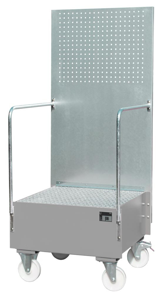 Auffangwanne mit Lochplatte, 3 mm Stahlblech, RAL 7005, fahrbar, für 1 St. 200-l-Fass, stehend Lagern, BxTxH 870x890x2110 mm, Auffangvol. 203 l