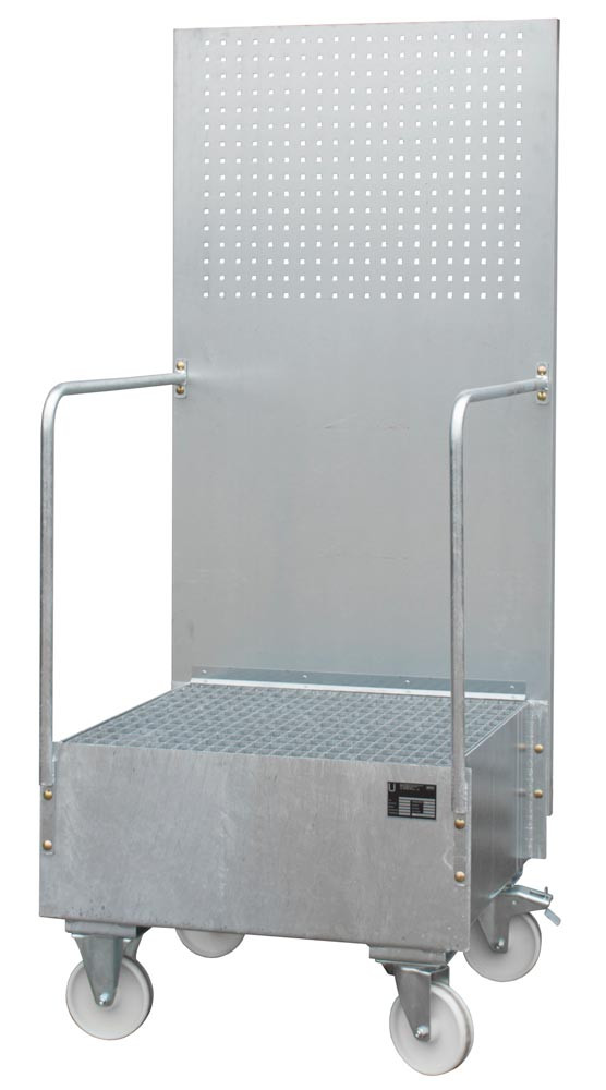 Auffangwanne mit Lochplatte, 3 mm Stahlblech, feuerverzinkt, fahrbar, für 1 St. 200-l-Fass, stehend Lagern, BxTxH 870x890x2110 mm, Auffangvol. 203 l