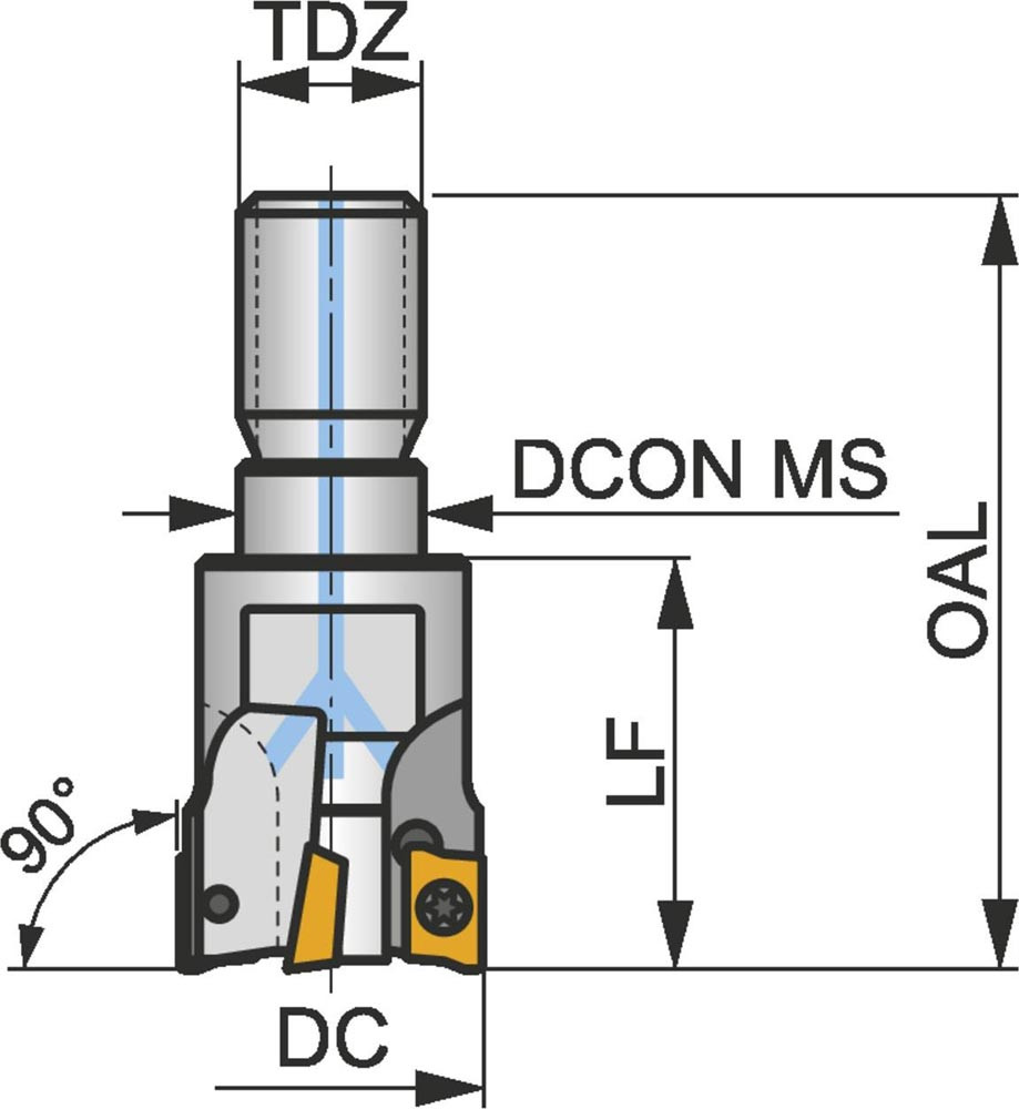 Eckfräser mit positiver/negativer Geometrie zum spannen von 3 Stück ADMX 11T3.. oder ADEX 11T3.. einseitigen Wendeschneidplatten · Schnittdurchmesser 20mm mit 90° Anstellwinkel und M10 Gewindeschaft für modulare Standardhalter · 26mm Überstandslänge · Kühlkanalbohrung zum Kopierfräsen · flachen Schulterfräsen · flachen Nutfräsen · Rampen · Helikalen Fräsen · Tauchfräsen und progressiven Eintauchen mit einer maximalen Schnitttiefe von 9.0mm