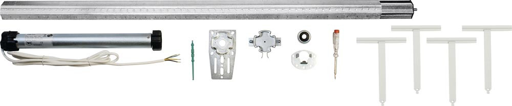Lieferumfang: Adapter Mitnehmer, Click-Antriebslager, Altbaulager, Achtkant-Stahlwelle SW60, Teleskopverlängerung inkl. Walzenkapsel, 4 Befestigungsfedern, Gegenlager inkl. Kugellager, Spannungsprüfer, Montagematerial, Einstellwerkzeug, Einbauanleitung