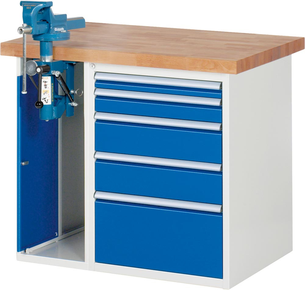 Baukastenwerkbank, Platte Buche 40 mm, 5 Schubladen: 60,90, 2x150, 270 mm, 1 Schrank. m. Schraubstock, BxTxH 1000x700x890 mm, RAL 7035/5010