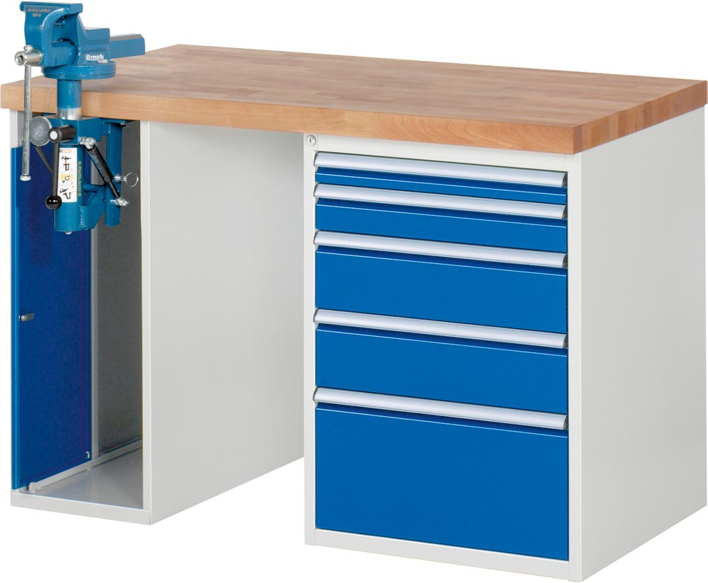 Baukastenwerkbank, Platte Buche 40 mm, 5 Schubladen: 60,90, 2x150, 270 mm, 1 Schrank. m. Schraubstock, BxTxH 1250x700x890 mm, RAL 7035/5010