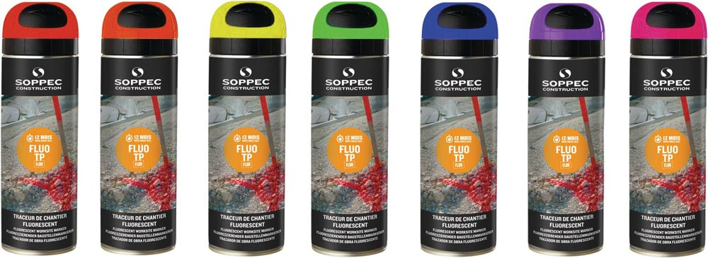 hervorragende Leucht- und Deckkraft · fluoreszierende Farben · anwendbar für Markierungen auf der Baustelle, für Bohrungen, Sondierungen, bei Vermessungsarbeiten, bei Elektrizitäts-, Gas- und Wasserarbeiten · provisorische Markierung bis zu 12 Monate sichtbar · extrem gute Haftung auf jeglichen Untergründen - auch nassen · feiner und präziser Strahl ermöglicht Schriften und Zeichnungen · Anwendung auch bei Minusgraden möglich · umweltfreundlich · ausgestattet mit der patentierten Soppec-Schutzkappe mit praktischen Verschlussmechanismus