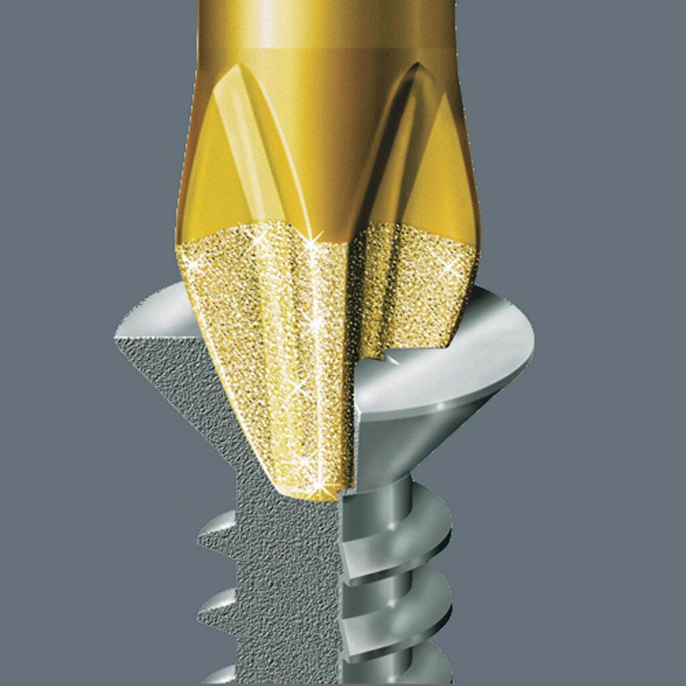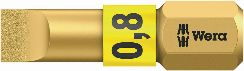 Bits für Schlitzschrauben mit winzigen Diamantpartikeln auf der Bitspitze. Diese sorgen für sicheren Sitz in der Schraube · reduzieren den benötigten Anpressdruck und reduzieren die Gefahr des Abrutschens. Mit Torsionszone · in die bei Belastungsspitzen kinetische Energie abgeleitet wird. Dadurch signifikante Erhöhung der Produktlebensdauer. 1/4″-Sechskant · passend für Halter nach DIN ISO 1173-D 6,3. Vorteile: Für Schlitzschrauben. Mit BiTorsion-Zone zur Abfederung von Belastungsspitzen. Erhebliche Verringerung der Bruchgefahr · deutliche Verlängerung der Lebensdauer. Diamantbeschichtung für sicheren Sitz in der Schraube. 1/4″ Sechskant-Antrieb (Wera Anschluss-Reihe 1). Mit Werkzeugfinder Take it easy: Farbkennzeichnung nach Profilen und Größenstempelung. Bits für Schlitzschrauben mit winzigen Diamantpartikeln auf der Bitspitze. Diese sorgen für sicheren Sitz in der Schraube · reduzieren den benötigten Anpressdruck und reduzieren die Gefahr des Abrutschens. Mit Torsionszone · in die bei Belastungsspitzen kinetische Energie abgeleitet wird. Dadurch signifikante Erhöhung der Produktlebensdauer. 1/4″-Sechskant · passend für Halter nach DIN ISO 1173-D 6,3.