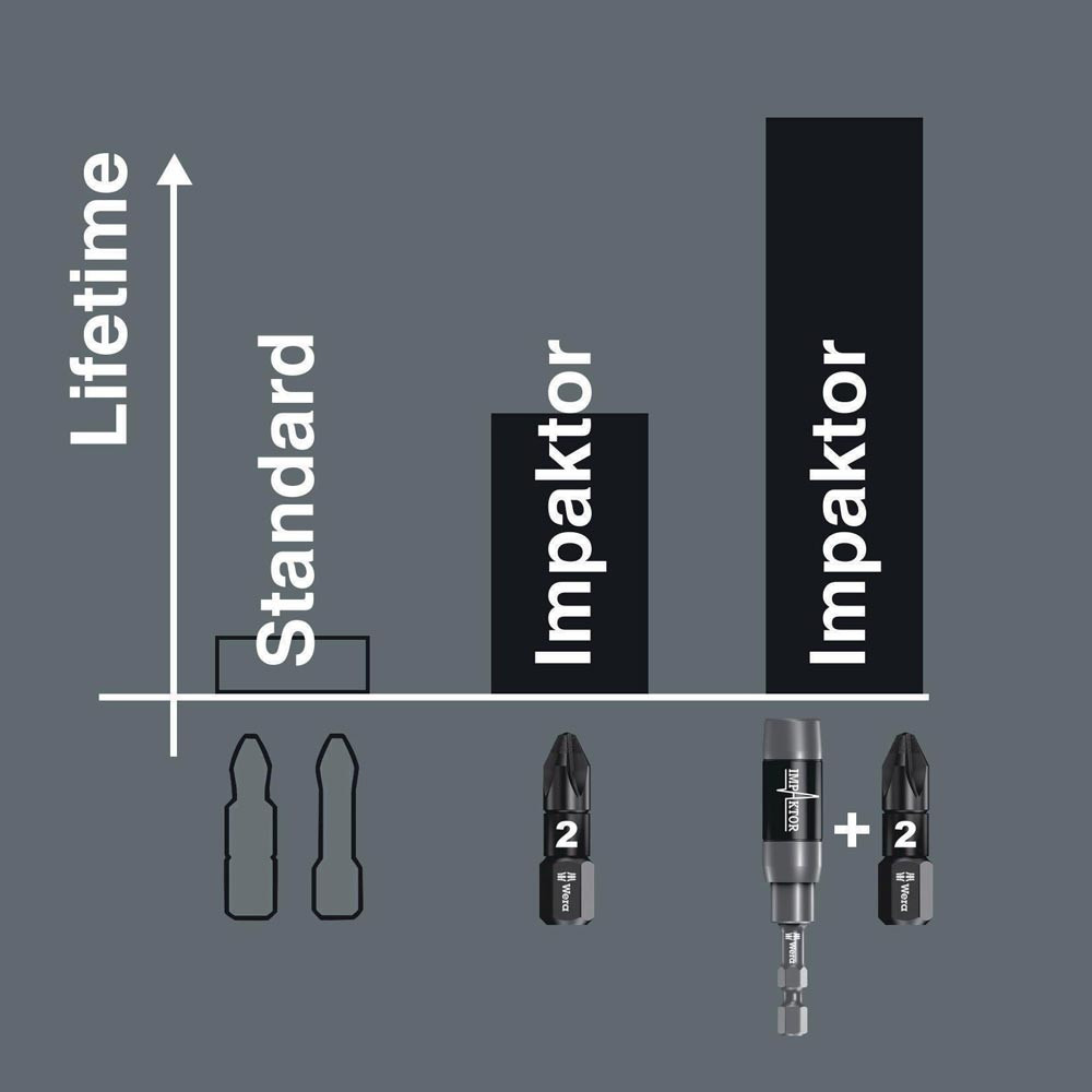 Hochwertige Bits für Pozidriv*-Schrauben. Die Impaktortechnologie sorgt für überdurchschnittliche Standzeiten auch bei extremen Anforderungen. Erhöhter Reibungswiderstand durch raue Diamantpartikelbeschichtung auf der Bitspitze verhindern das Herausrutschen aus der Schraube. Besonders geeignet für den Einsatz mit handelsüblichen Impakt-/Schlagschraubern. 1/4″-Sechskant · passend für Halter nach DIN ISO 1173-D 6,3. * Pozidriv = eingetragenes Warenzeichen der Firma European Industrial Service Ltd.