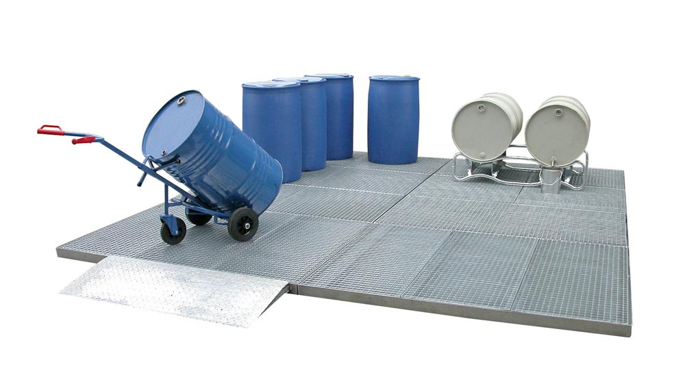 ∙ Zur Lagerung wassergefährdender und entzündbarer Flüssigkeiten ∙ Konstruktion aus 3 mm Stahlblech ∙ Einzelsegmente können beliebig untereinander kombiniert werden ∙ Mit herausnehmbaren, hochbelastbaren, feuerverzinkten Gitterrosten ∙ Hoher Korrosionsschutz durch Verzinkung ∙ Radlast 450 kg ∙ Belastung 5000 kg/m2