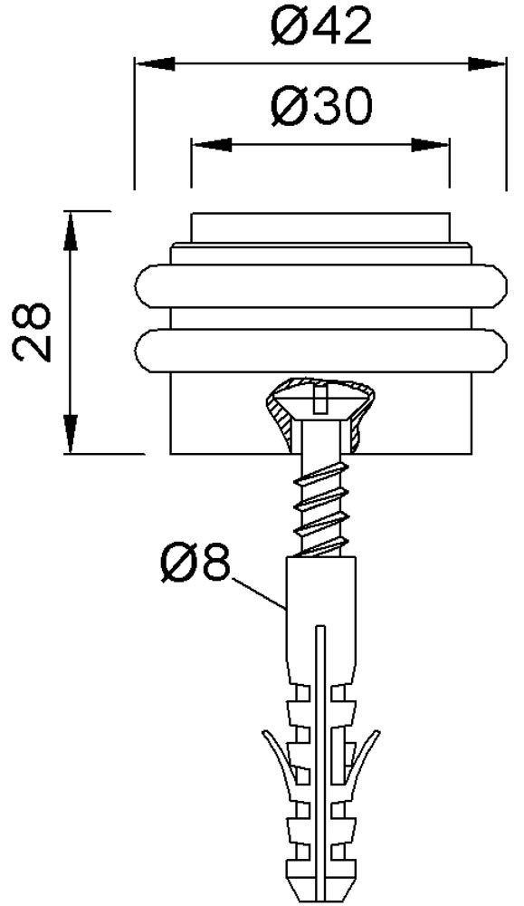 mit Befestigungsmaterial · Ø 42 mm · Höhe 28 mm · mit schwarzem Gummipuffer und 2 schwarzen Gummiringen · für Wand- und Bodenmontage