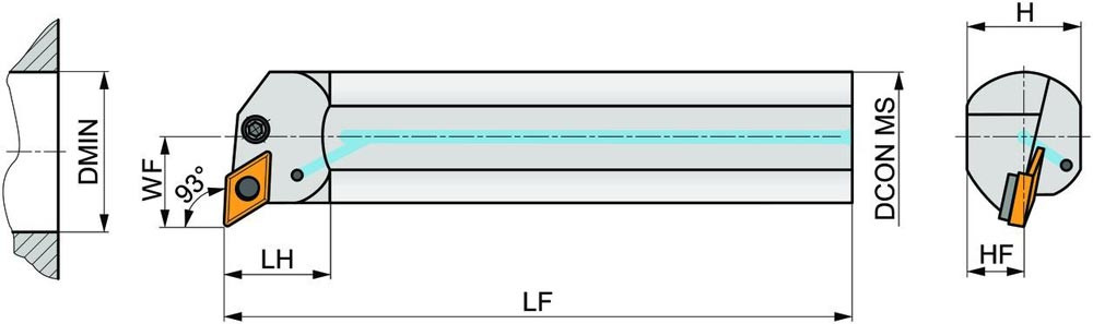 Dreh-Bohrstange mit Kniehebelklemmung zum spannen von 55° Rhombus negative Wendeschneidplatten mit einem Innenkreisdurchmesser von 9.525mm · 4.76mm Dick (ISO Bezeichnung DN.. 1104.. ) · linke Ausführung zum 93° Längsdrehen mit abgesetzem Schaft · Stahl ohne Kühlkanalbohrung · 25mm Durchmesser x 200mm Länge für Innenkegeldrehen · Kopierdrehen in einer und mehreren Richtungen und Längsdrehen mit und ohne Schulter