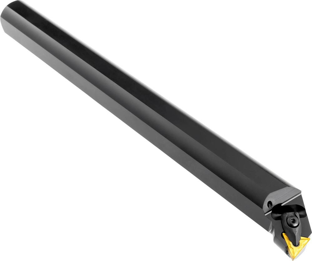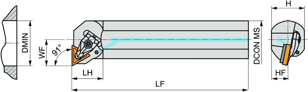 Dreh-Bohrstange doppelt geklemmt zum spannen von Triangular negative Wendeschneidplatten mit einem Innenkreisdurchmesser von 9.525mm · 4.76mm Dick (ISO Bezeichnung TN.. 1604.. ) · linke Ausführung zum 90° Längsdrehen mit abgesetzem Schaft · Stahl mit Kühlkanalbohrung · 25mm Durchmesser x 300mm Länge für Innenentgraten · Innenkegeldrehen und Längsdrehen ohne Schulter