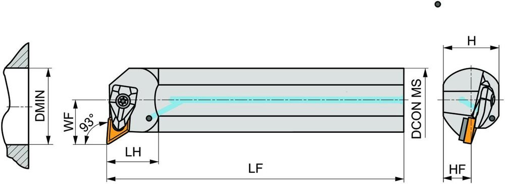 Dreh-Bohrstange doppelt geklemmt zum spannen von 55° Rhombus negative Wendeschneidplatten mit einem Innenkreisdurchmesser von 12.7mm · 6.35mm Dick (ISO Bezeichnung DN.. 1506.. ) · linke Ausführung zum 93° Längsdrehen mit abgesetzem Schaft · Stahl mit Kühlkanalbohrung · 50mm Durchmesser x 350mm Länge für Innenentgraten · Innenkegeldrehen · Kopierdrehen in einer und mehreren Richtungen und Längsdrehen mit und ohne Schulter