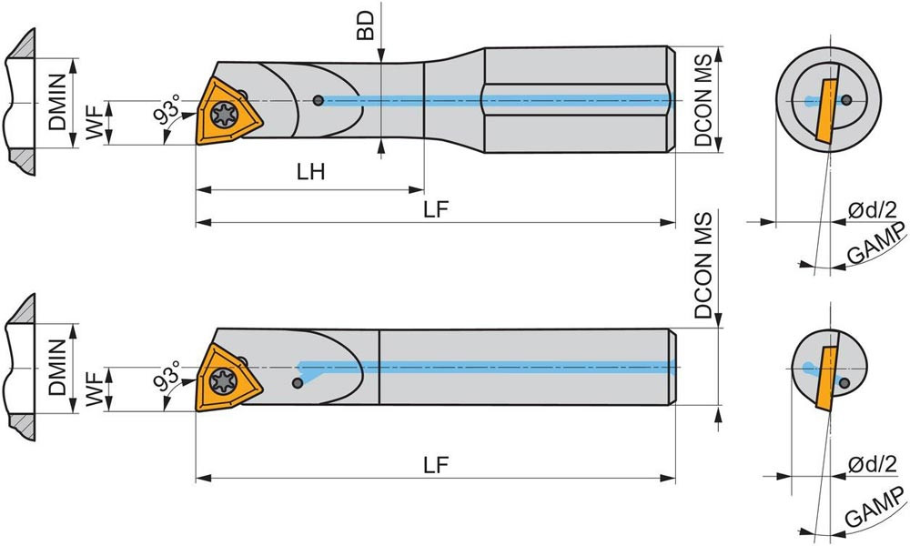 Dreh-Bohrstange mit Schraubklemmung zum spannen von 80° Trigonal positive Wendeschneidplatten mit einem Innenkreisdurchmesser von 3.97mm · 1.59mm Dick (ISO Bezeichnung WC.. 0201.. ) · rechte Ausführung zum 93° Längsdrehen mit abgesetzem Schaft · Hartmetall mit Kühlkanalbohrung · 5mm Durchmesser x 80mm Länge für Innenkegeldrehen und Längsdrehen mit und ohne Schulter