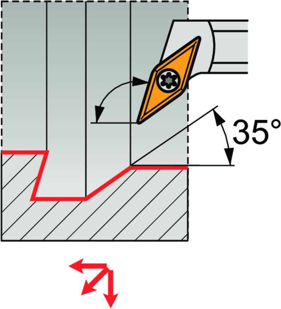 Dreh-Bohrstange mit Schraubklemmung zum spannen von 35° Rhombus positive Wendeschneidplatten mit einem Innenkreisdurchmesser von 9.525mm · 4.76mm Dick (ISO Bezeichnung VB.. 1604.. oder VC.. 1604.. ) · rechte Ausführung zum 107°30' Längsdrehen mit abgesetzem Schaft · Stahl ohne Kühlkanalbohrung · 40mm Durchmesser x 400mm Länge für Kopierdrehen in einer und mehreren Richtungen