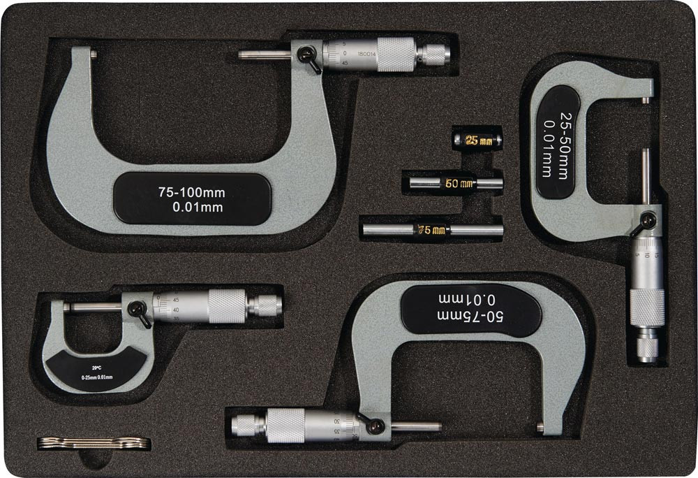 je 1 Bügelmessschraube 0-25, 25-50, 50-75 und 75-100 mm, 3 Einstellmaße