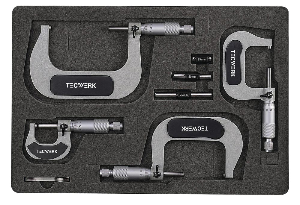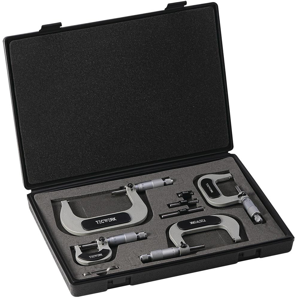 je 1 Bügelmessschraube 0-25, 25-50, 50-75 und 75-100 mm, 3 Einstellmaße