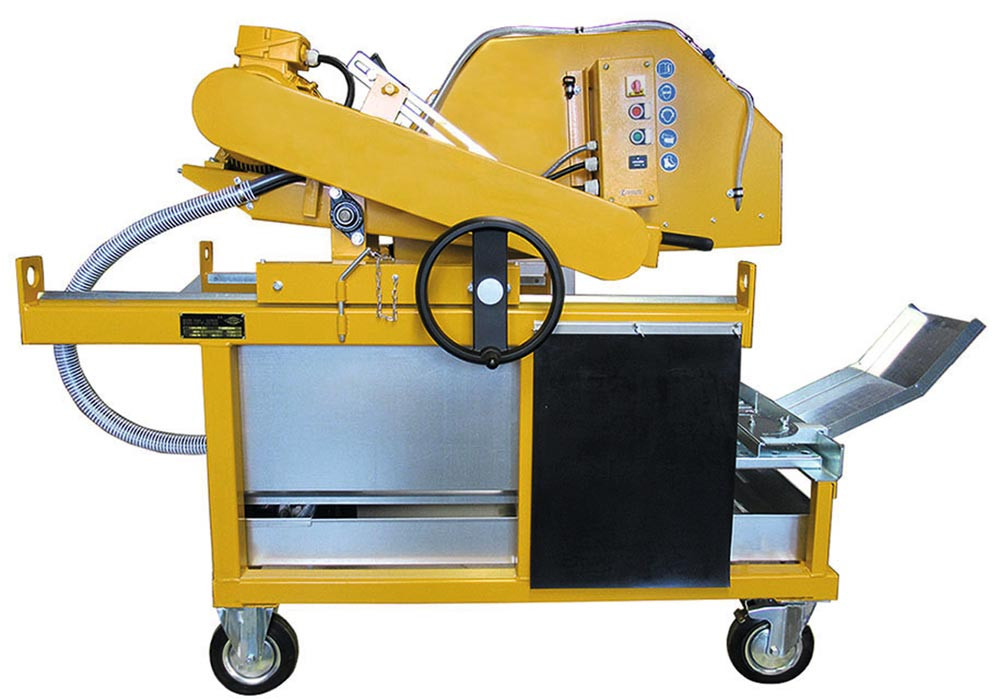 Fahrbare Tischsäge zum Trennen von großformatigen Baumaterialien, wie Poroton-, Kalksand- oder Betonsteinen ∙ Motor nach Schutzart IP 54 ∙ Höhenverstellbarer Sägekopf mit seitlichem Handradvorschub ∙ Kühlwasserversorgung durch elektrische Wasserpumpe ∙ Herausnehmbare 110 l Wasserwanne ∙ Einfacher Transport durch große Lauf- und feststellbare Lenkräder ∙ Mit automatischem Stern-Dreieck-Anlauf und Betriebsstundenzähler
