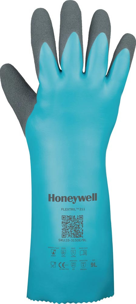 nach EN 388, EN 374, EN 407 · Kat. III · Material: Nitril mit Mikroschaum auf Nylon-Liner · hoher Schutz gegen Chemikalien, AQL 0,65 · zuverlässige Schnittfestigkeit durch Schnittschutzlevel A1/A · für Lebensmittel geeignet · Honeywell Super Grip-Technologie (SGT) bietet die benötigte Rutschhemmung, bei Trockenheit und Nässe · ergonomisches Design bietet Unterstützung der Hände sowie hohen Tragekomfort · kein Schwitzen dank der Honeywell Moisture Dispersion-Technologie