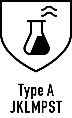 · Chemikalienfestigkeit: J = n-Heptan / K = Natriumhydroxid 40 % / L = Schwefelsäure 96 % / M = Salpetersäure 65 % / P = Wasserstoffperoxid 30 % / S = Flusssäure 40 % / T = Formaldehyd 37 %