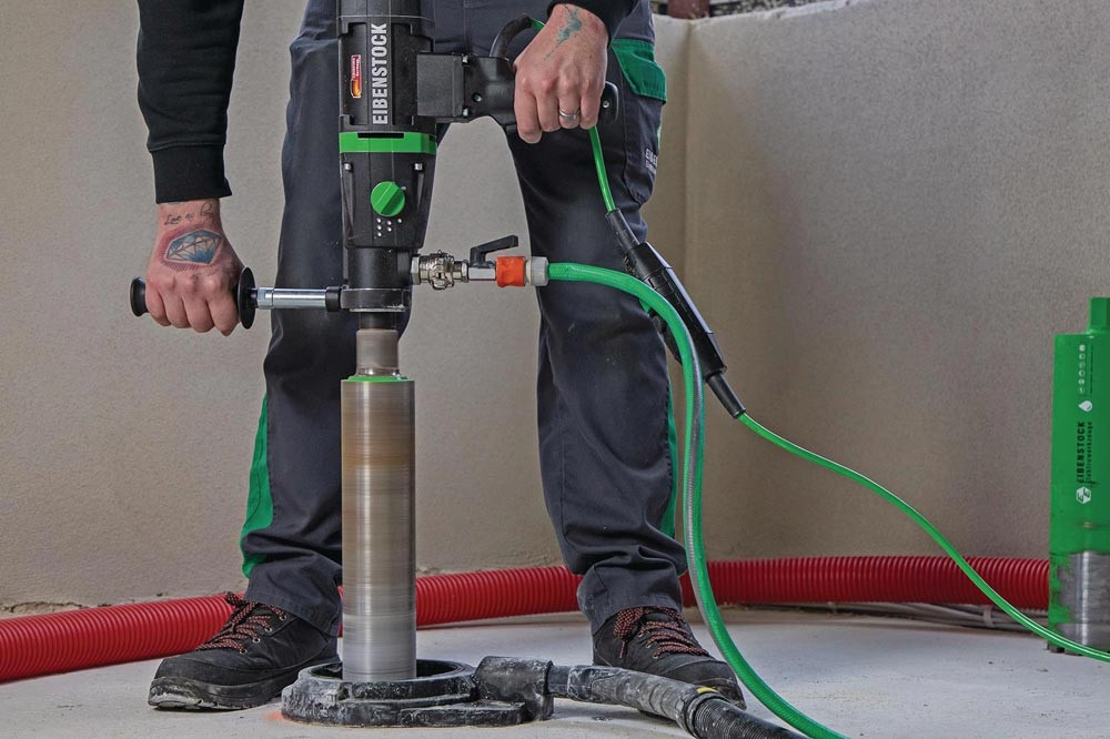 kraftvoller 2300 W Motor · Sanftanlauf · Überlastanzeige · Abschaltkohlenbürsten · 3-Gang-Ölbadgetriebe für optimale Schmierung · robuste Kombispindel für präzises Bohren · ergonomische Handgriffposition · integrierte Libellen auf Maschine und Handgriff · Trockenbohren in Kalksandstein, Mauerwerk, Klinker, Ziegel sowie Nassbohren in armierten Beton, Naturstein und Asphalt