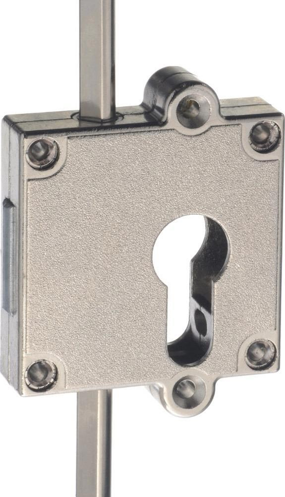 PZ Drehstangenschloss · aufliegend · Metall vernickelt · für Profilzylinder · mit Seitenriegel · Dornmaß 40 mm · für geteilte Stangen 8 x 7 mm · umstellbar von rechts auf links · Zylinder axial verstellbar · Zylinderbefestigung durch Schraube