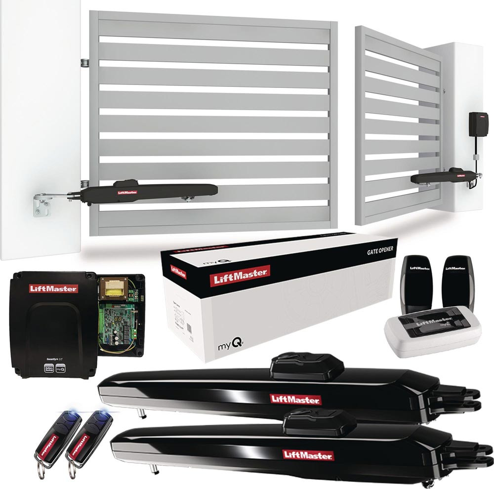 smartes Doppelflügeltoröffner-Kit, Smart-Paket · Schraubenstil 24V DC Antriebskit für Wohn-Doppelflügelschwingtore mit max. 300kg Flügelgewicht oder 3 Meter Flügelbreite (max. 6 Meter Öffnungsbreite mit 2 Flügeln) · max. Toröffnung von 120° · Torgewicht bei max. Flügelbreite: 300kg / 2m, 250kg / 2,5m, 200kg / 3m · Öffnungszeit 90°: ̴15-18s Max. Zyklen h/Tag: 10/30 · myQ-Version für die Smartphone-Steuerung durch das im Lieferumfang enthaltene LiftMaster myQ Gateway 828EV und ein Paar Lichtschranken 772E-01 · Motoren IP44, Steuerplatine IP65 · Energieeinsparung durch niedrigen Standby von 4,2 W