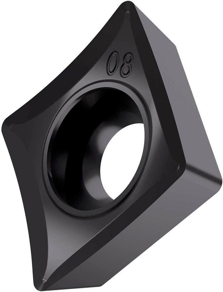 Einseitige positive Drehwendeschneidplatte · 80° Rhombisch mit 7° Freiwinkel · Innenkreisdurchmesser von 12.7mm · 4.76mm Dick · 0.8mm Radius · Indexgenauigkeit nach ISO-Toleranzklasse-G · Spanbrecher SF3 mit verrundeter Schneidkante · im Substrat T8415.