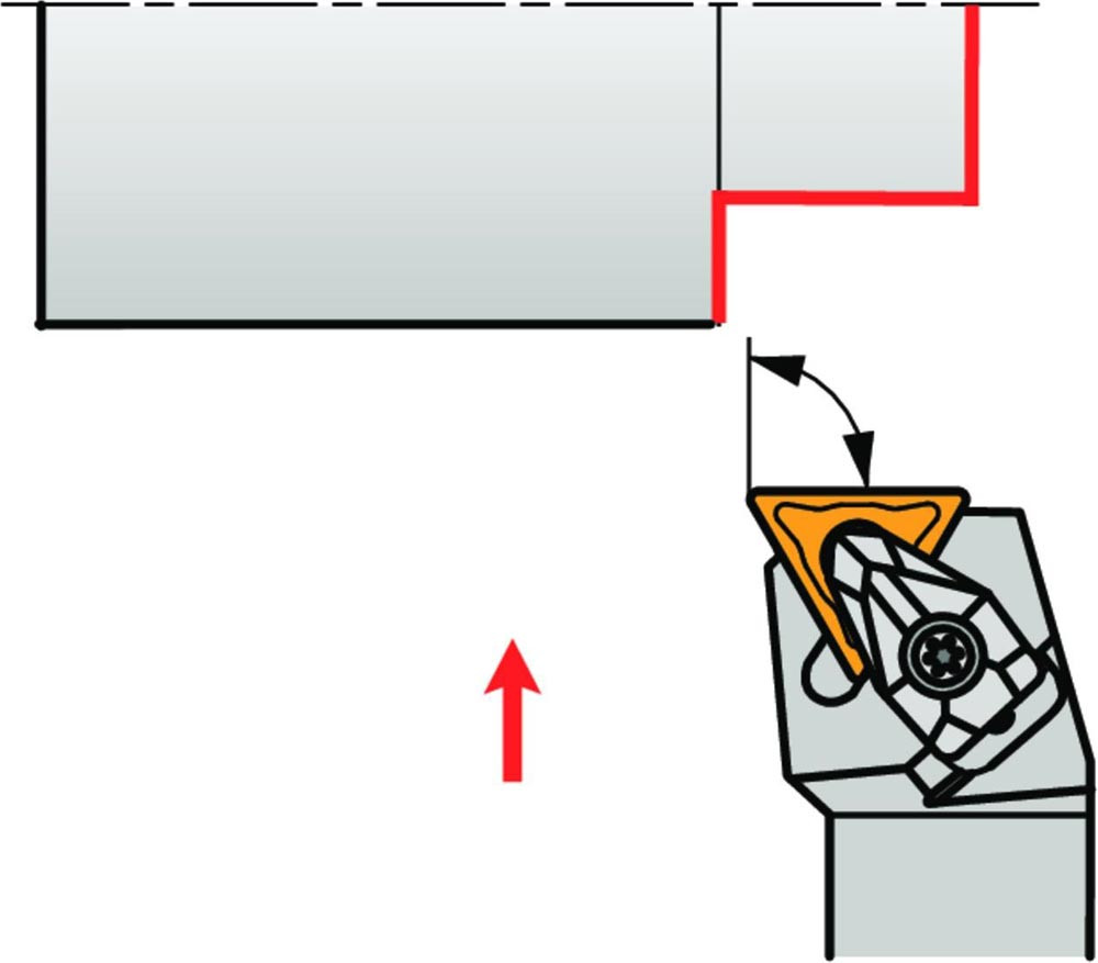 Dreh-Trägerwerkzeug doppelt geklemmt zum spannen von Triangular negative Wendeschneidplatten mit einem Innenkreisdurchmesser von 12.7mm · 4.76mm Dick (ISO Bezeichnung TN.. 2204.. ) · rechte Ausführung zum 90° Längsdrehen mit abgesetzem Schaft · 25mm Werkzeughöhe x 25mm Breite x 150mm Länge für Stirndrehen ohne Schulter
