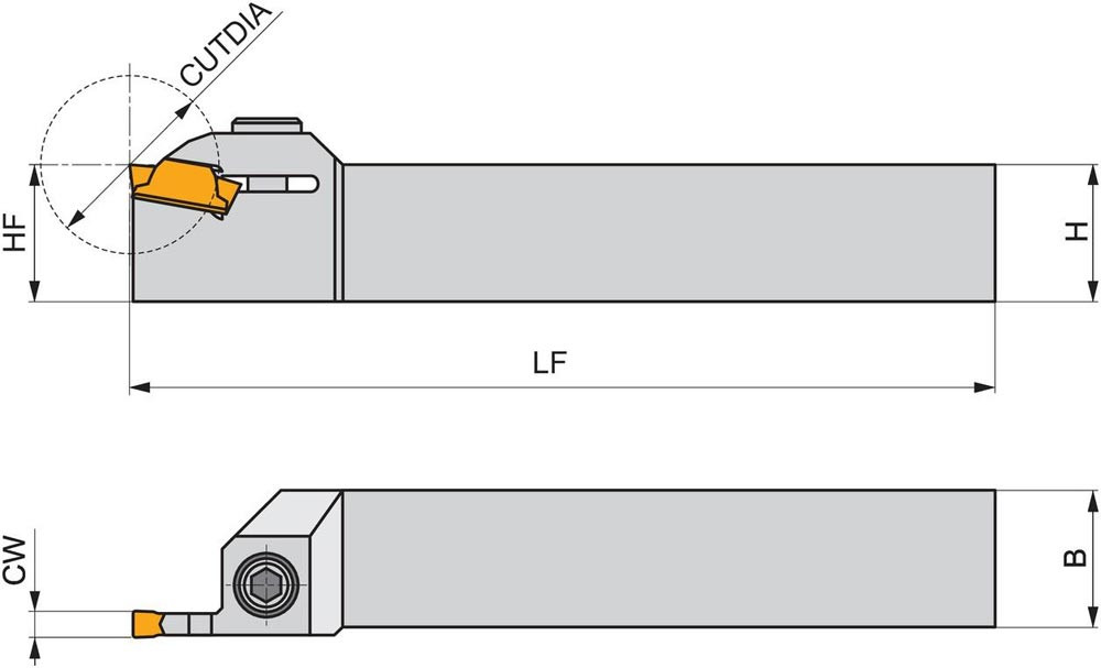 Einstechwerkzeug von oben geklemmt zum spannen einer 16.4mm langen doppelt oder einseitigen Wendeschneidplatte mit 5mm Schnittbreite (Bezeichnung LCM. 0516.. ) · rechte Ausführung mit Wendeschneidplatte parallel zum Schaft für einen maximalen Stechdurchmesser von 28mm · Schafthöhe 25mm · Breite 25mm und Werkzeuglänge 150mm zum Mehrweg Kopierdrehen · flaches und tiefes radiales Einstechen · radiales Stechdrehen · Abstechen und Rohr-Abstechen