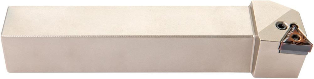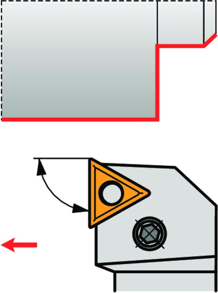 Dreh-Trägerwerkzeug mit Kniehebelklemmung zum spannen von Triangular negative Wendeschneidplatten mit einem Innenkreisdurchmesser von 9.525mm · 4.76mm Dick (ISO Bezeichnung TN.. 1604.. ) · linke Ausführung zum 90° Stirndrehen mit abgesetzem Schaft · 20mm Werkzeughöhe x 20mm Breite x 125mm Länge für Kegeldrehen und Längsdrehen ohne Schulter