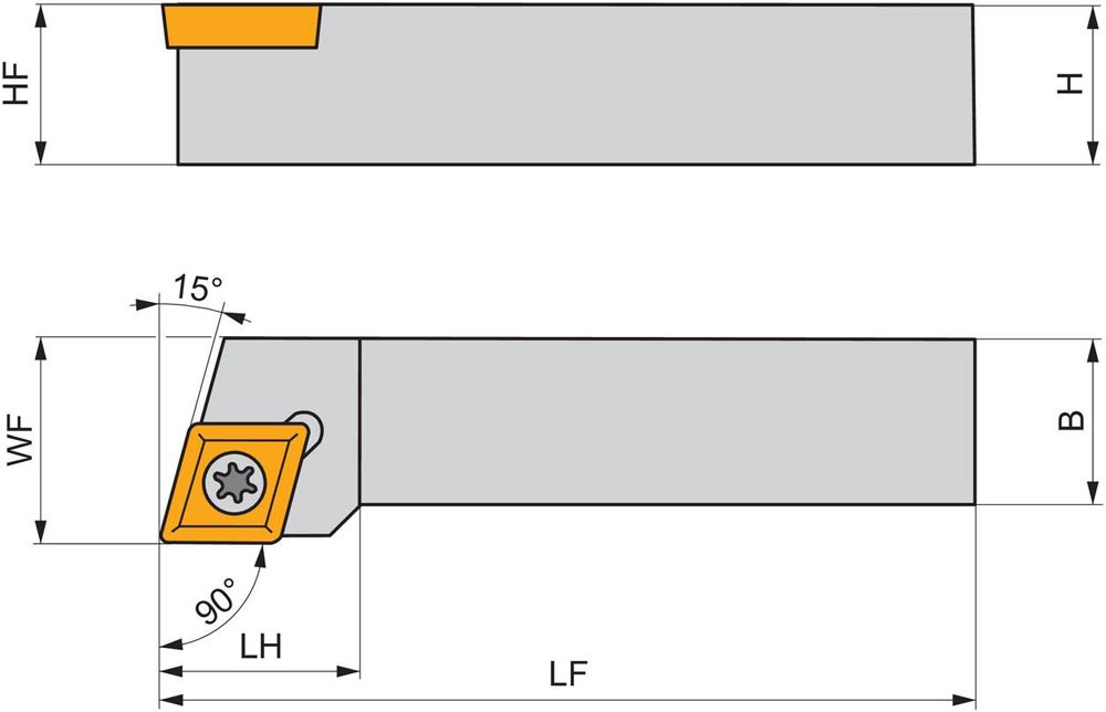 Dreh-Trägerwerkzeug mit Schraubklemmung zum spannen von 75° Rhombus positive Wendeschneidplatten mit einem Innenkreisdurchmesser von 7.94mm · 3.18mm Dick (ISO Bezeichnung EC.. 0803.. ) · rechte Ausführung zum 90° Stirndrehen mit abgesetzem Schaft · 16mm Werkzeughöhe x 16mm Breite x 100mm Länge für entgraten · Kegeldrehen und Längsdrehen ohne Schulter