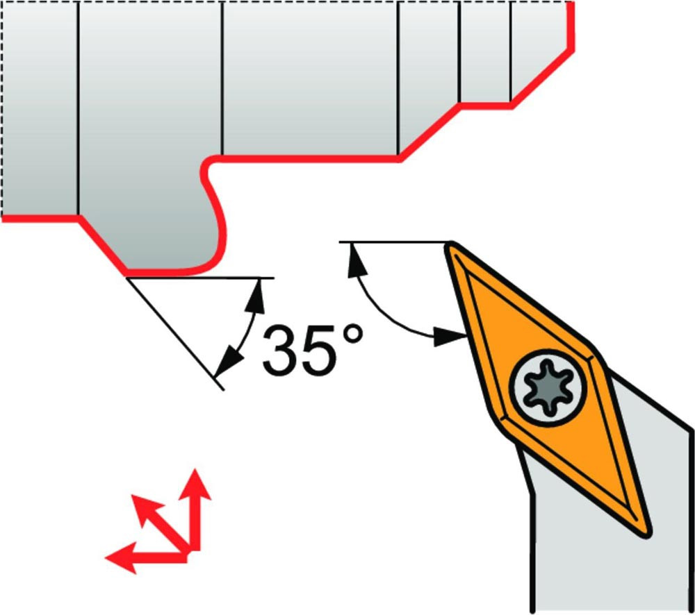Dreh-Trägerwerkzeug mit Schraubklemmung zum spannen von 35° Rhombus positive Wendeschneidplatten mit einem Innenkreisdurchmesser von 9.525mm · 4.76mm Dick (ISO Bezeichnung VB.. 1604.. oder VC.. 1604.. ) · rechte Ausführung zum 107°30' Stirndrehen mit abgesetzem Schaft · 25mm Werkzeughöhe x 25mm Breite x 150mm Länge für Kegeldrehen · Kopierdrehen in einer und mehreren Richtungen und Längsdrehen mit und ohne Schulter