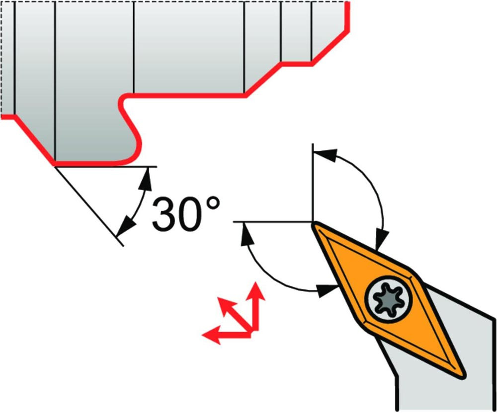 Dreh-Trägerwerkzeug mit Schraubklemmung zum spannen von 35° Rhombus positive Wendeschneidplatten mit einem Innenkreisdurchmesser von 9.525mm · 4.76mm Dick (ISO Bezeichnung VB.. 1604.. oder VC.. 1604.. ) · rechte Ausführung für Sonderanwendungen · 32mm Werkzeughöhe x 25mm Breite x 170mm Länge für Kegeldrehen · Kopierdrehen in einer und mehreren Richtungen und Längsdrehen mit und ohne Schulter