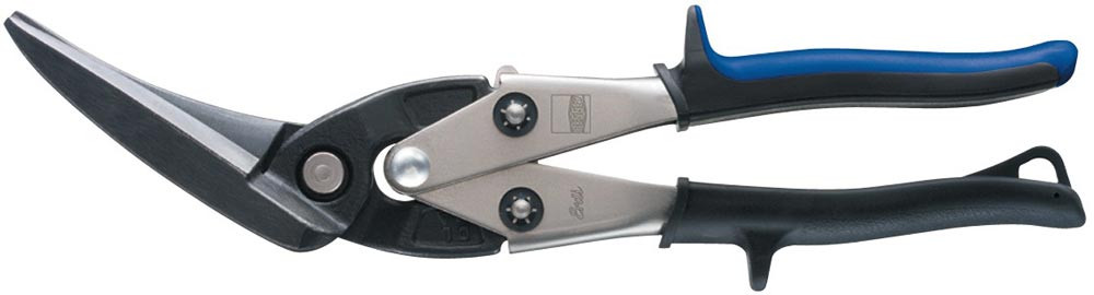 Schneiden aus Edelstahl induktiv gehärtet 59 HRC, im Gesenk geschmiedet · geeignet für lange und gerade durchlaufende Schnitte sowie große Radien · doppelt hebelübersetzt · 64 mm lange Schneide · Sicherheitsdelta zum Werkstoff durch Abwinkelung des Scherenkopfes · nur linksschneidend lieferbar · leichte, stabile Griffe mit ergonomischen 2-Komponenten-Hüllen und Abgleitschutz