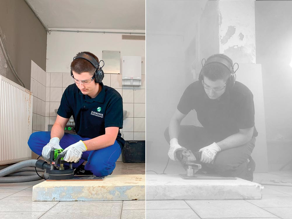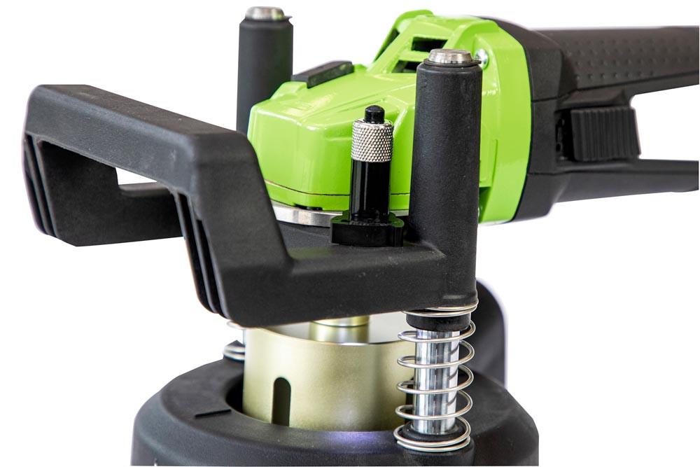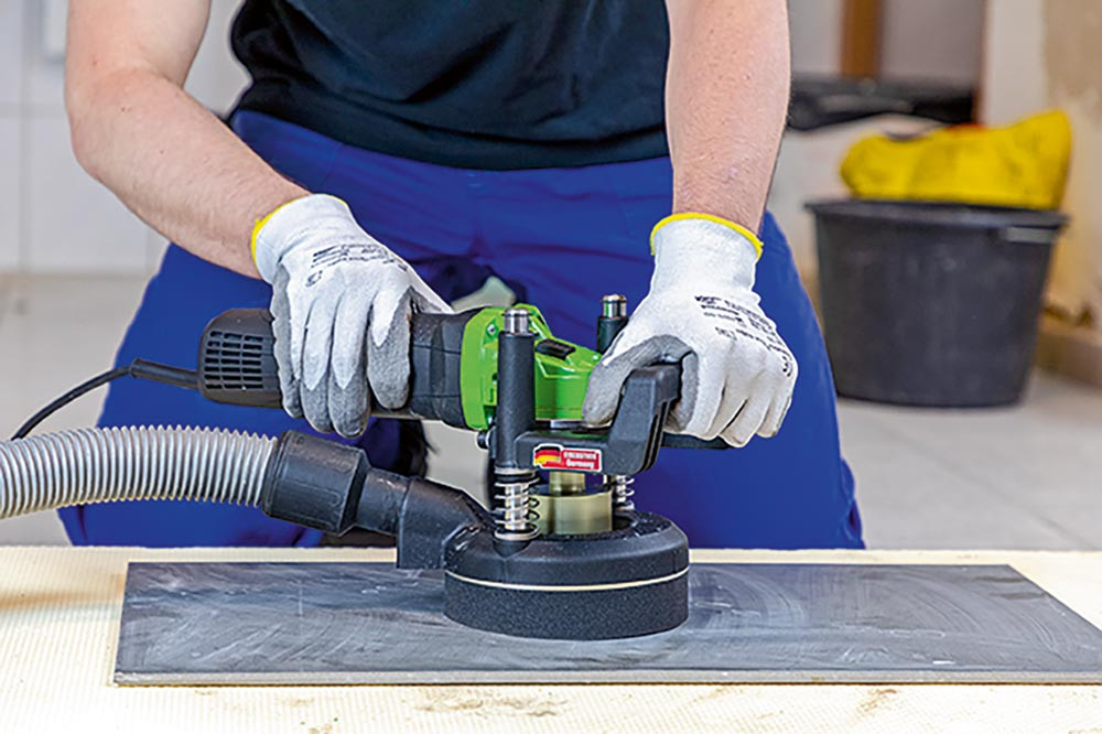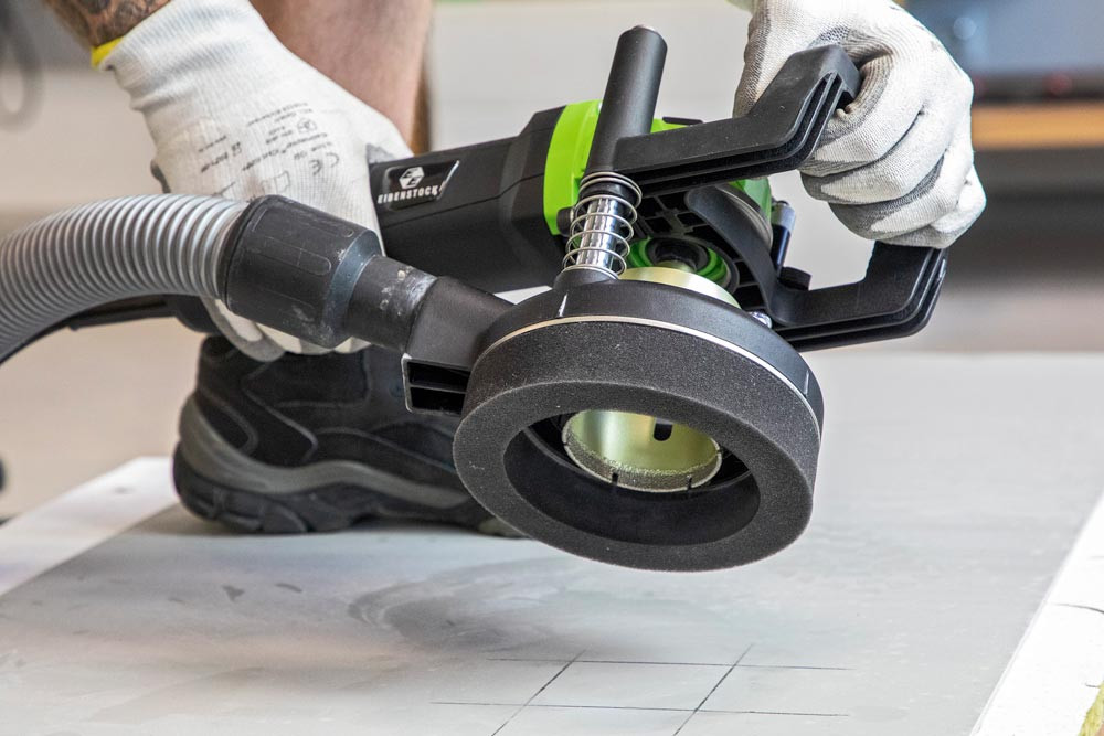 Ausführung: Präzise und staubarme Fliesenbohrmaschine für nahezu staubfreies Bohren - Trockenbohren von Granit, Fliesen und Platten aus keramischen Materialien und Naturstein - Herstellung von Bohrungen für Armaturen- und Rohrdurchführungen, Einbauleuchten und Schalter ∙ Exakte Positionierung der Maschine durch Stützhaube + LED Licht ∙ Elektronik - Sanftanlauf ∙ Drehzahlregelung und- Konstanthaltung