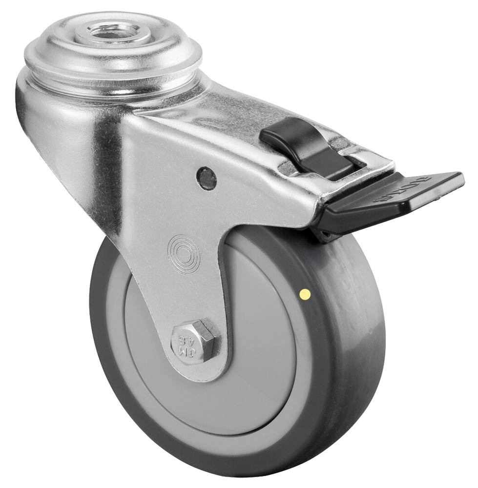 ESD-Apparaterolle, Lenkrolle mit Feststeller, Gummi thermoplastisch grau, Durchm. 50 mm, Traglast 50 kg, Kugellager, Rückenloch