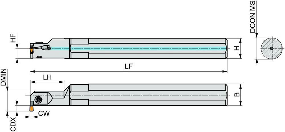 Einstechbohrstange von oben geklemmt zum spannen einer 12.6mm langen doppelt oder einseitigen Wendeschneidplatte mit 3mm Schnittbreite (Bezeichnung LCM. 0313.. ) · linke Ausführung mit Wendeschneidplatte senkrecht zum Schaft für eine maximale Einstechtiefe von 6.5mm · Schaftdurchmesser 25mm und Werkzeuglänge 250mm zum inneres Einstechen und Stechdrehen